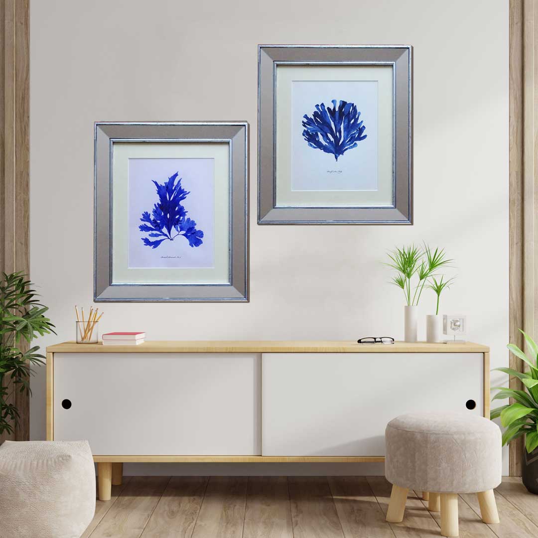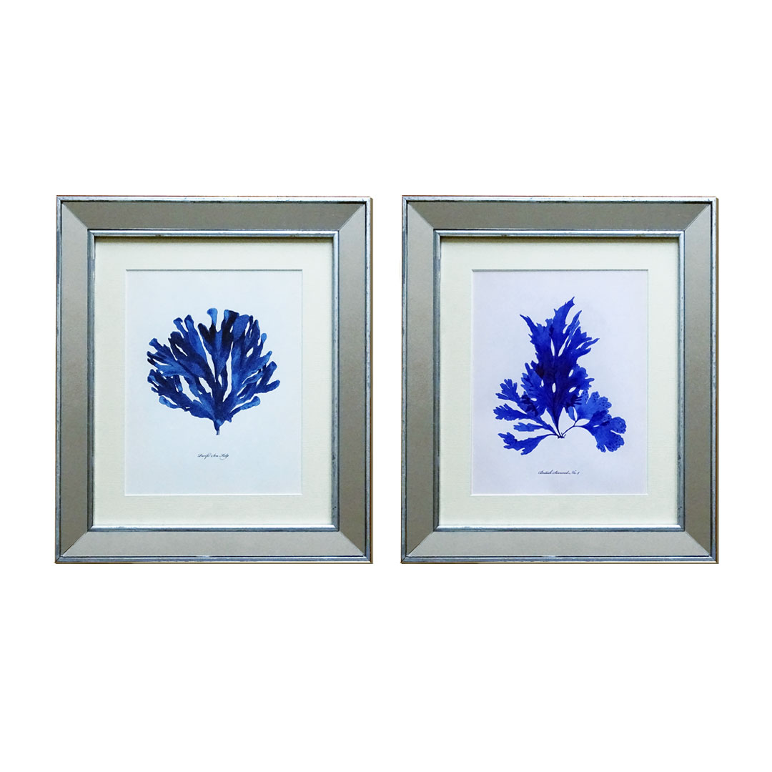 Set 2 Cuadros Corales Marítima II Azul Marco Espejo Plata – 43X50